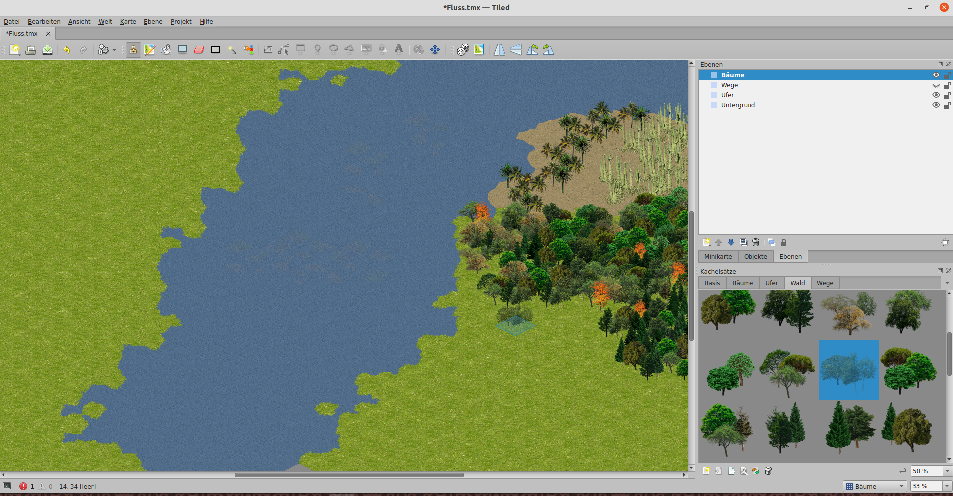 Für Wald gibt es zwei Variationen, zwei verschieden Tilesets. Beide sind doppelt hoch, also 240 x 240 Pixel groß. Das Tileset Wald beinhaltet frei kombinierbare Baumgruppen, das Tileset Bäume einzelne Bäume.