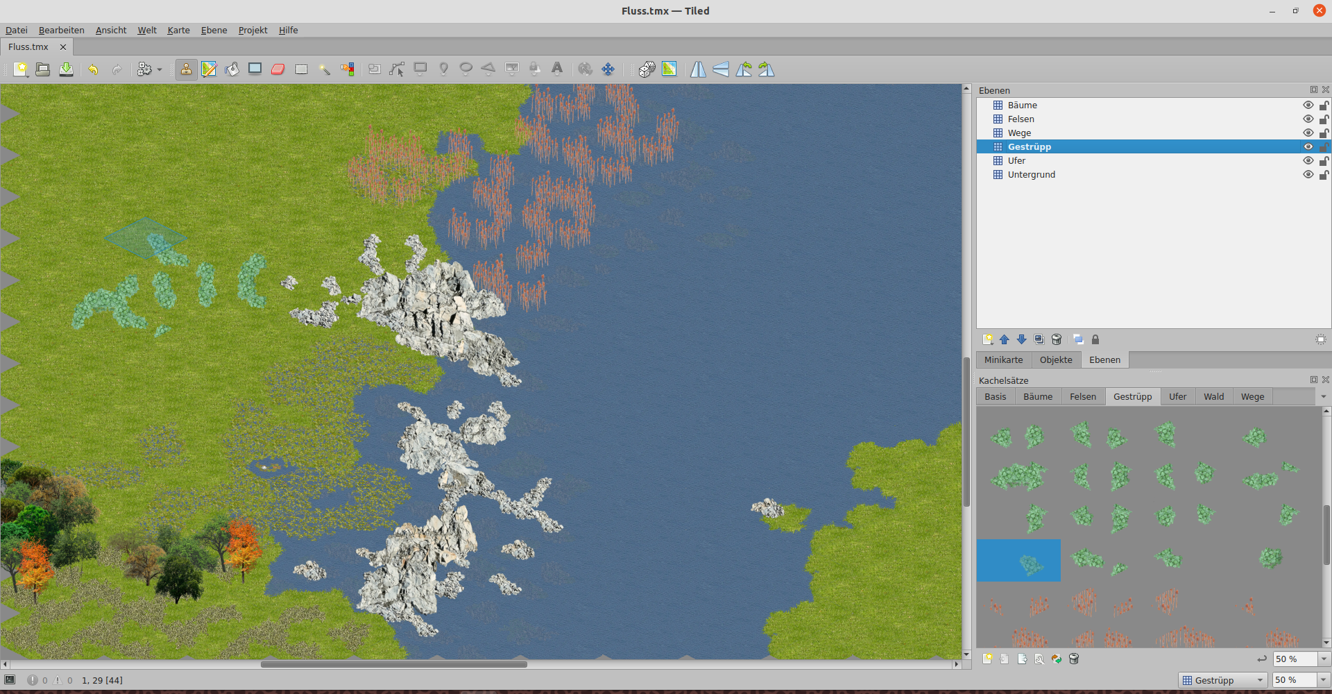 Die Ebene für diese Landschaften positioniert man am besten oberhalb der Ebene Ufer. Man kann aber auch andere Ebenen nutzen. Das Schilf habe ich auf der Ebene Wald eingefügt, um Sumpf darunter möglich zu machen. Es gibt kein Dogma für die Ebenenwahl.