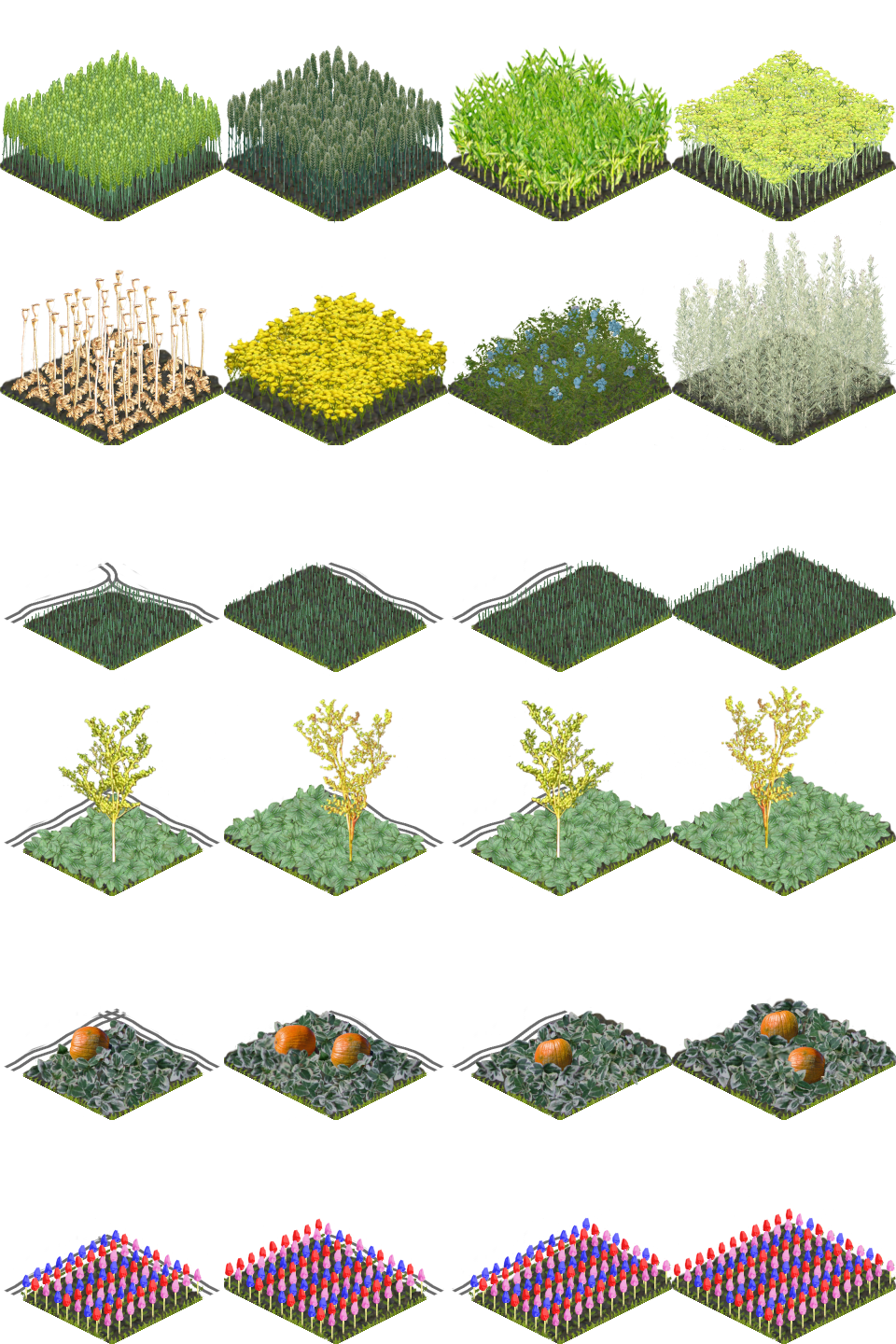 Jetzt wird es bunt. Wie man die Felder in einem Spiel einsetzt und welche Güter dort neben Nahrung darauf produziert werden, darf sich jeder selbst ausdenken. Öl, Färbemittel und Fasern zum Beispiel. Ich wollte nur etwas Farbe ins Bild bringen.