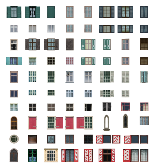 Aus diesen Vorgaben ergibt sich eine Höhe von 30 Pixeln für eine Tür und 15 Pixeln für ein normales Fenster, was gerade noch reicht, um ein paar Details anzudeuten. Ob es für die Gebäude wirklich notwendig ist unterschiedliche Fenster zu nutzen und auch noch Gardinen darin zu platzieren oder Fensterläden geschlossen oder offen einzubauen, ist Ansichtssache. Auch wenn solche Details im fertigen Bild nur bei genauer Betrachtung sichtbar sind, sind sie mir wichtig.